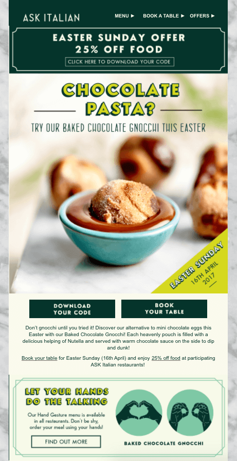Here's an example from Ask Italian that prompts curiosity ("Chocolate Pasta"), looks awesome, uses pun-filled copy ("don't gnocchi until you've tried it") and delivers a clear and attractive money-off seasonal incentive: