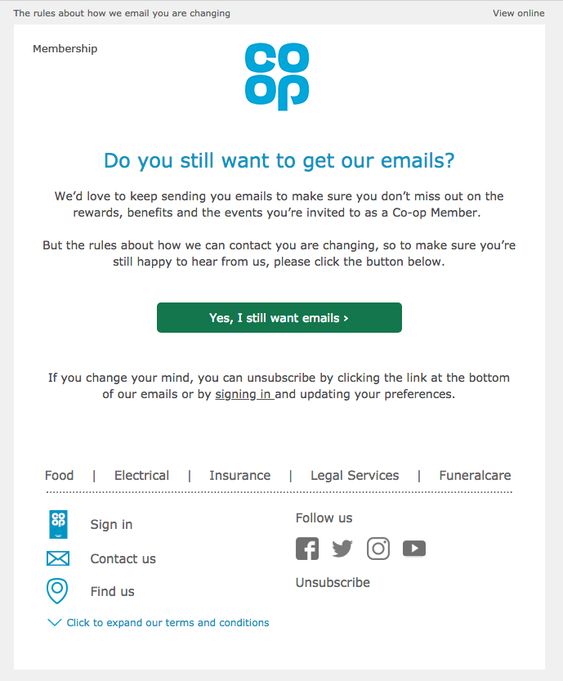 This email from Co-op is short, sweet and to the point. The email directly asks subscribers if they want to continue to receiving the brand's emails, whilst reminding them of the benefits of they'll get as a Co-op Member.